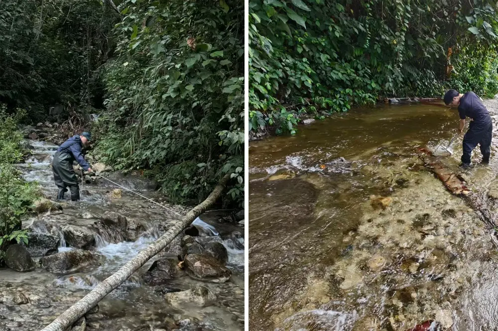 图为墨脱流施密摇蚊栖息地环境照。上海海洋大学林晓龙副教授(左)和硕士研究生张智超(右)正在采集水生昆虫。(西藏自治区高原生物研究所“达娃创新工作室”供图)